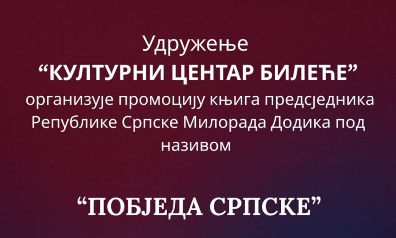 У Билећи ће вечерас бити промовисана књига „Побједа Српске“ аутора Милорада Додика.