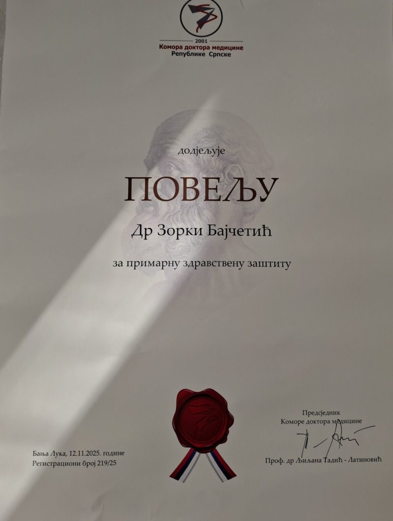 Докторица Зорка Бајчетић, љекар породичне медицине у Дому здравља „Свети Лука“ у Билећи, добитница је признања Коморе доктора медицине Републике Српске за најбољег љекара породичне медицине у 2025. години.