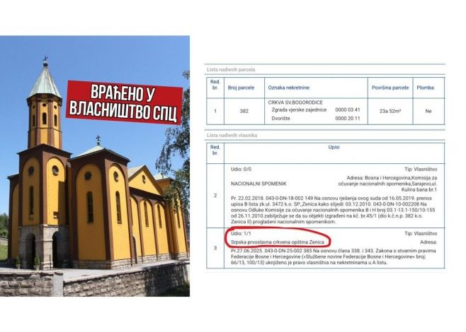 Одбор за заштиту права Срба у ФБиХ саопштио је прошле недјеље да су у току хармонизације усаглашавања података земљишних књига и катастра, рјешењем општинског суда у Зеници од 16. маја 2019. године, црква и земљиште око цркве уписани у својину „државе“ један кроз један.